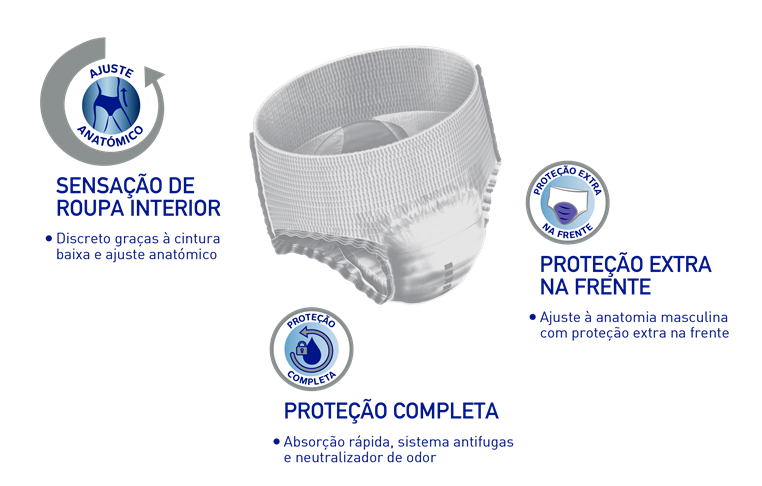 Cuecas absorventes para perdas de urina, que proporcionam proteção mantendo a pele saudável.